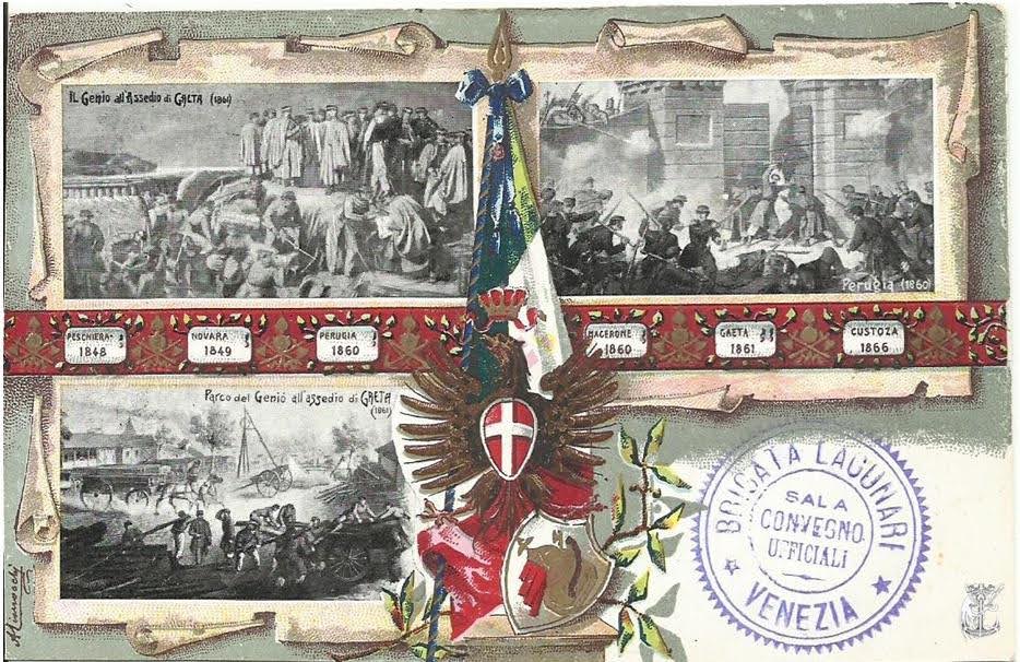 Nel libro scritto dal Colonnello Mangione (pubblicato da Helvetia Edizioni nel 1991) sono elencati i reparti del Genio che per cinquantasei anni (dal 1877 al 1933) hanno denominazioni in cui appare l’aggettivo «lagunari». Non ne avevo mai sentito parlare prima e, per completare il quadro, su input del Colonnello Grazioli, ho trovato una cartolina militare datata 1904 a riguardo.