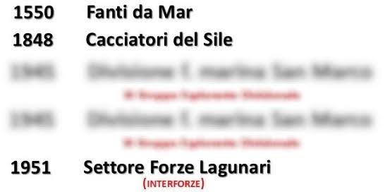 Nel 1951, a sei anni dal termine della seconda guerra mondiale, gli Stati Maggiori di Esercito e Marina danno vita ad un’unità mista (interforze) denominata Settore Forze Lagunari. Soldati e marinai assieme, con mostreggiature simili; sembra quasi un prolungamento della Divisione San Marco vista in precedenza.